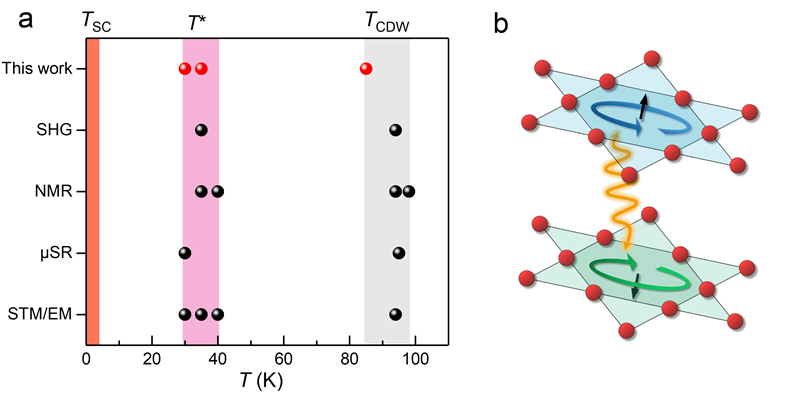 图2 CsV3Sb5相图与轨道电流序示意图。(a).总结了文献中报道的CVS相变(黑点)和本项研究中观测到的相变(红点)。(b). CVS中三维轨道电流序的示意图。