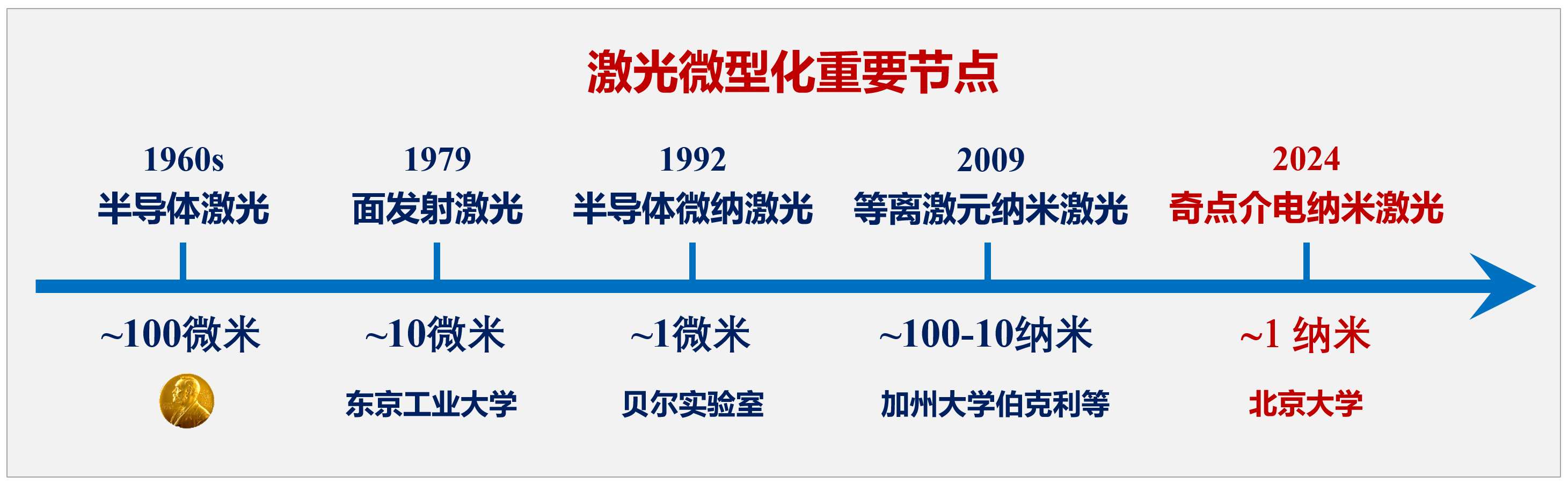 图1.激光微型化的重要节点。红宝石官方网站hbs备用构建了介电质体系突破光学衍射极限的理论,发明了制备具有原子级特征尺度光学纳腔的新方法,首次提出并实现了奇点介电纳米激光,将激光特征尺度推进至原子尺度。