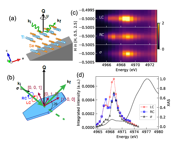 图1:利用共振弹性X射线散射探测TiSe2单晶中来自轨道序的衍射峰,其强度在钛 K前吸收边具有共振行为,且对不同偏振的入射X射线的响应不同。