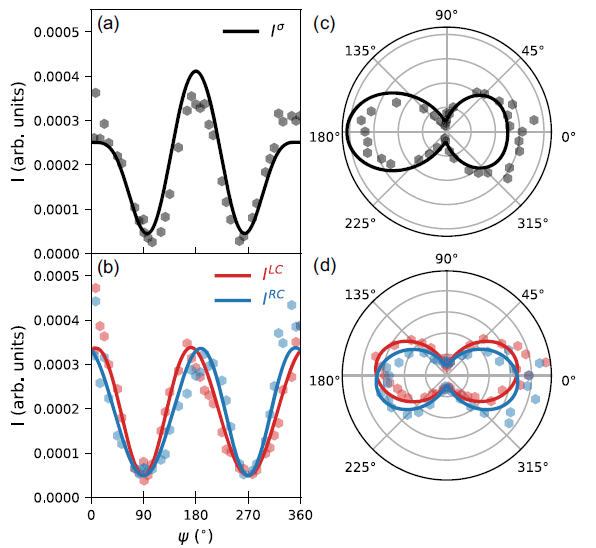 常规X射线衍射技术对晶体中的螺旋轴并不敏感,因此无法直接探测材料的手性。而共振X射线散射技术则突破了这一限制。此前,彭莹莹与合作者利用该技术揭示了TiSe2中的轨道序(Physical Review Research 4, 033053 (2022)),但其与电子手性之间的关联仍不清晰。在最新研究中,彭莹莹课题组通过钛K边的共振弹性X射线散射实验,首次观测到TiSe₂轨道序的衍射峰展现出显著的圆二色性(高达40%)。在传统的电荷密度波相中,这些衍射峰由于中心反演对称性被禁止,而在破缺这一对称性的轨道序相中,这些峰表现出强烈的散射强度,并且随着入射能量变化呈现出明显的双峰特征(图1),表明这些信号主要由钛3d轨道的t2g和eg电子贡献。更值得关注的是,衍射峰的圆二色性强度随方位角发生显著变化。通过将实验数据与理论计算对比,研究发现圆二色性的角度依赖性与电子手性相中原子位移模型的计算结果高度吻合(图2)。这一发现首次提供了1T-TiSe₂体相中电子手性的明确证据,揭示了其与轨道序之间的内在联系。该研究为深入理解电荷密度调制、轨道占据、对称性自发破缺与手性之间的相互作用机制提供了全新视角。此外,这一研究结果还证明,共振弹性X射线散射是探测材料电子手性的灵敏工具,具有广泛的应用潜力,可用于探索更多材料体系的电子手性。