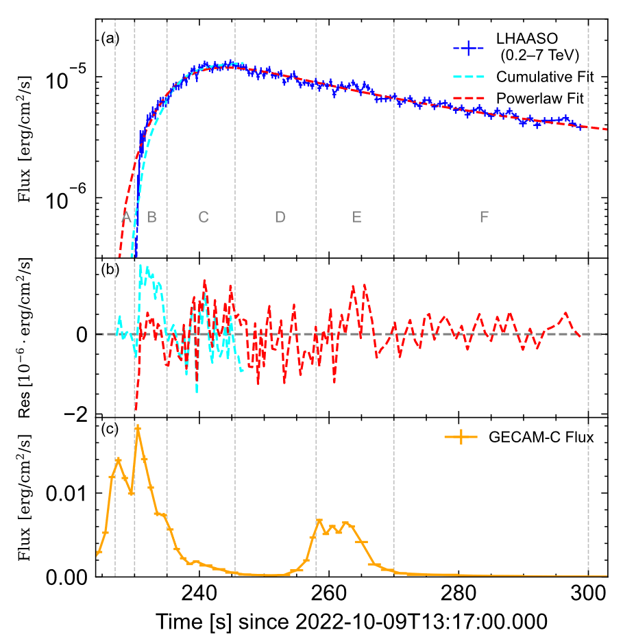 图2:研究团队发现GECAM-C测量的瞬时辐射(橙色)与LHAASO测量的余辉辐射(蓝色)存在紧密关联[1].