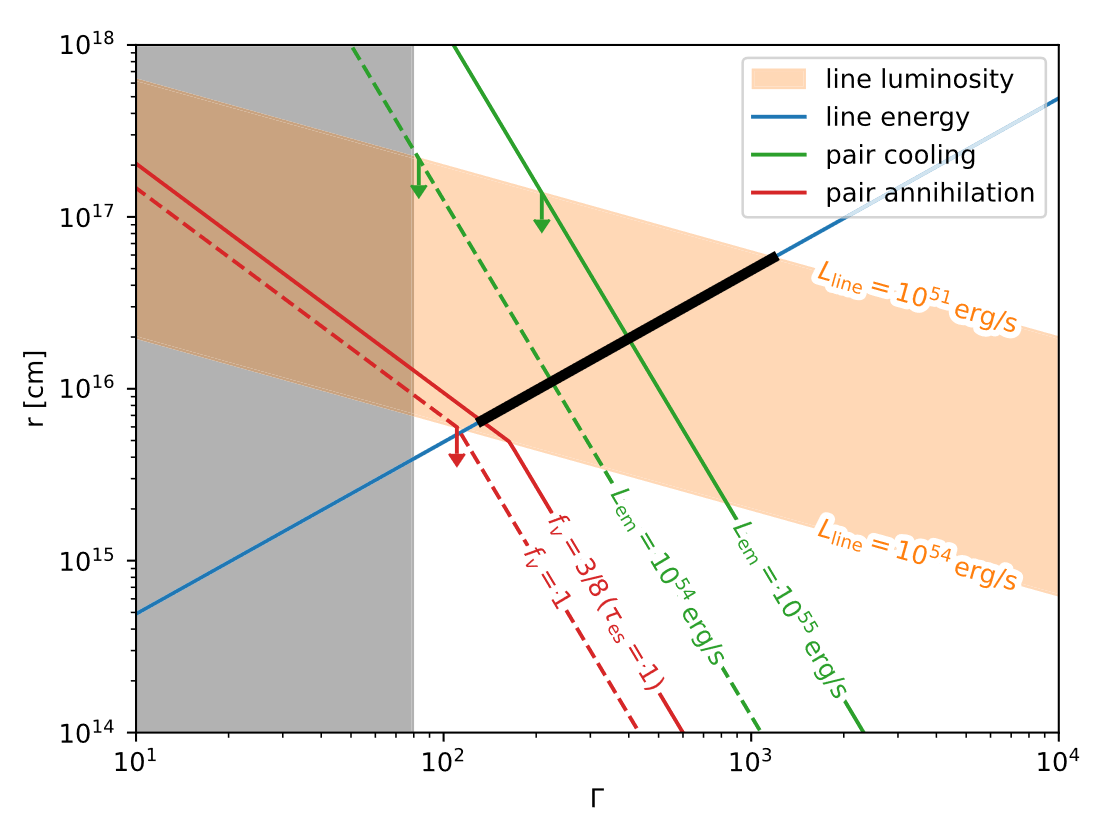 图3:研究团队建立理论模型解释伽马谱线观测结果,对喷流速度(洛伦兹因子Γ)和辐射区尺度(半径r)进行严格限制[2].