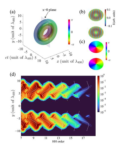 图1.涡环光场高次谐波频谱出现独特的空间啁啾特征,频域干涉条纹数量反映了谐波横向轨道角动量的阶数。