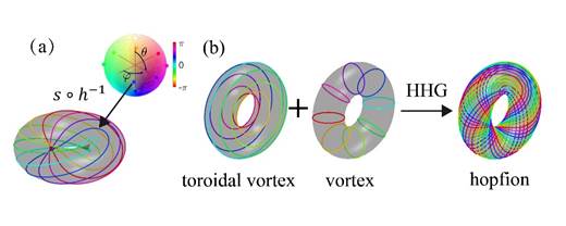 图3.(a)Q=1的霍普夫子拓扑结构。 (b)利用涡环光场(toroidal vortex)和涡旋光场(vortex)双色光场驱动,通过高次谐波非线性过程形成高阶霍普夫子。