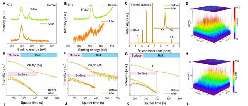 有机无机杂化钙钛矿材料作为一种新型高效廉价的光伏半导体,将助力我国更好地实现碳中和目标。钙钛矿作为新兴半导体,其材料及器件的主要制备和表征方法都借鉴于传统半导体。但是钙钛矿具有与它们截然不同的晶体特性,例如明显较弱的化学键和较软的晶格等,因此这些常规方法例如高真空热蒸发制备金属电极过程等是否仍然完全适用于钙钛矿需要深入探索。这些过程是否会导致最终工作于器件中的薄膜和预先优化的薄膜是不一致的?薄膜优化是否可以完全贡献于最终器件性能的提升?这些问题很少受到领域的普遍关注。该研究首先通过一系列表界面表征方法对新鲜制备的电极和钙钛矿薄膜进行了测量和表征(图1),证实了钙钛矿薄膜表面在电极制备过程中发生了组分逃逸和部分降解。