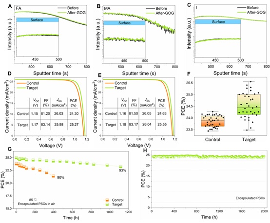 为解决这一关键问题,课题组提出通过插入较厚保护层来削弱电极制备过程对钙钛矿薄膜影响的策略,巧妙设计了一种由氧化石墨烯和天然石墨薄片构成的双层结构来作为钙钛矿薄膜的保护层。一系列对钙钛矿薄膜的表征结果表明该保护层可以确保钙钛矿膜在电极制备前后的成分和光电性质的一致性。质谱结果证明在电极制备前后,钙钛矿薄膜的所有组分几乎保持不变(图3a-c)。最后,通过添加该保护层降低电极制备过程造成的薄膜损伤,将钙钛矿太阳能电池的光电转换效率从24.63%显著提升到25.55%(图3)。此外,实验结果还证实了该保护层同时有利于提升薄膜的水氧、光热稳定性和对抗离子迁移方面的稳定性。封装的器件在85 ℃加热老化1100小时后仍能保持初始效率的93%,在最大功率点跟踪2000小时后表现出基本不变的优异稳定性(图3)。上述结果验证了添加该保护层可消除电极制备前后造成的薄膜不一致性,有望将薄膜优化最大化贡献于最终器件光伏性能的提升。