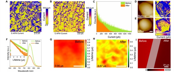 进一步通过导电AFM揭示出电极制备过程削弱了钙钛矿薄膜表面的导电性(图2),光学测量表征显示出电极制备过程导致钛矿薄膜表面的缺陷密度增加,载流子寿命下降。共聚焦激光扫描显微镜观测到同样的变化规律。后续对薄膜厚度相关的时间分辨光致发光衰减动力学表征结果表明,电极制备过程提高了钙钛矿薄膜的表面复合速率而对体复合寿命的影响相对较小,进一步说明电极制备主要恶化了钙钛矿薄膜表面,从而对后续器件性能造成影响。