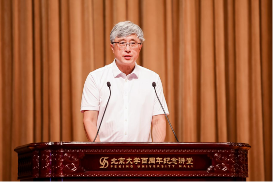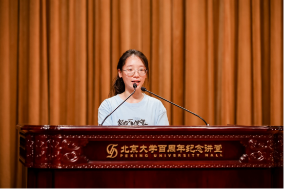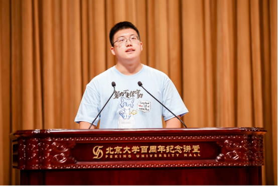 陈元同学作为本科新生代表,他表达了对大学生活的期待与憧憬。他回顾了自己为了考入北大物理学院所付出的努力与汗水和开学进入北大后的点点滴滴,并表示将珍惜在北大的每一刻时光,守护心之所向,为理想和责任而不懈奋斗。