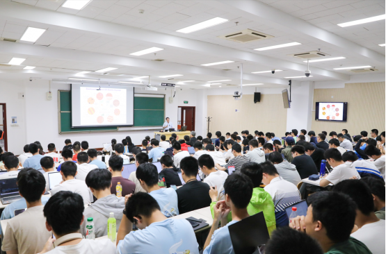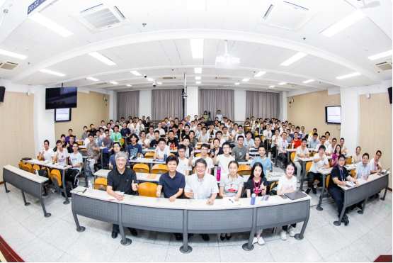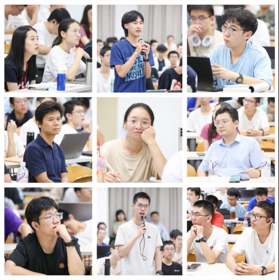 高鸿钧(一排左三)、高原宁(一排左一)等与物理学院2024级新生相聚在中秋节前夕的课堂上