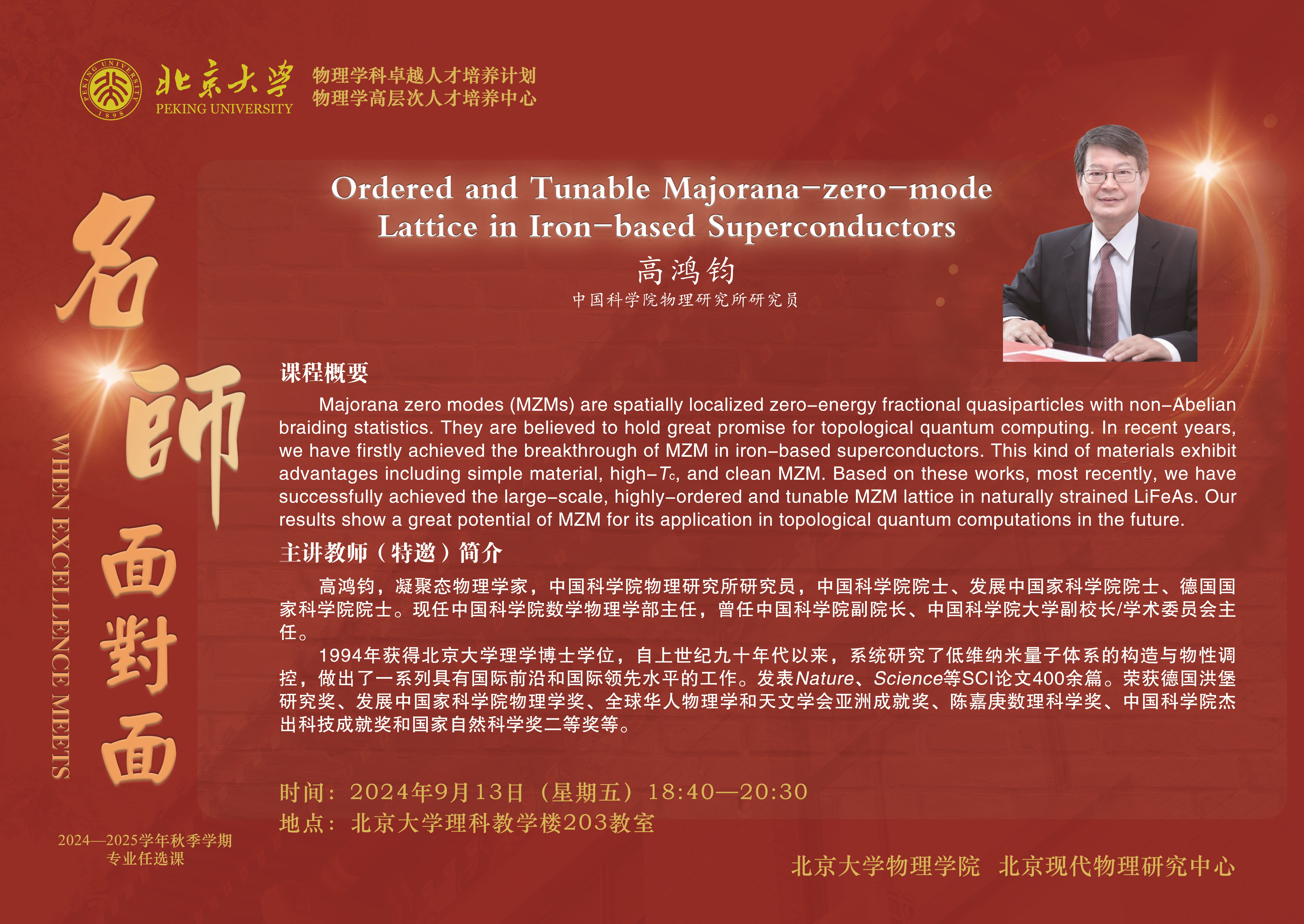 2024年9月13日晚,由我院物理学院、北京现代物理研究中心主办的“我院物理学科卓越人才培养计划讲堂:名师面对面”(第二十七期)在红宝石官方网站hbs备用理科教学楼203教室举行。中国科学院物理研究所研究员高鸿钧院士应邀讲授“基于铁基超导体的有序和可调控的马约拉纳零能模格点阵列”(Ordered and Tunable Majorana-zero-mode Lattice in Iron-based Superconductors)。本期讲堂由我院物理学院院长、北京现代物理研究中心副主任高原宁院士主持。