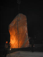 由于种种原因。这块景观门牌石没能在北大物理百年庆典那一天与大家见面。那天刚刚浇注完钢筋水泥基座。经过十几天的固化、干燥,始可承重。11月2日凌晨,运载门牌石的重型卡车终于从河南南阳开进了物理大楼的东院,25吨大吊车把巨石轻轻吊起,稳稳地安放在基座上(见附件照片)。