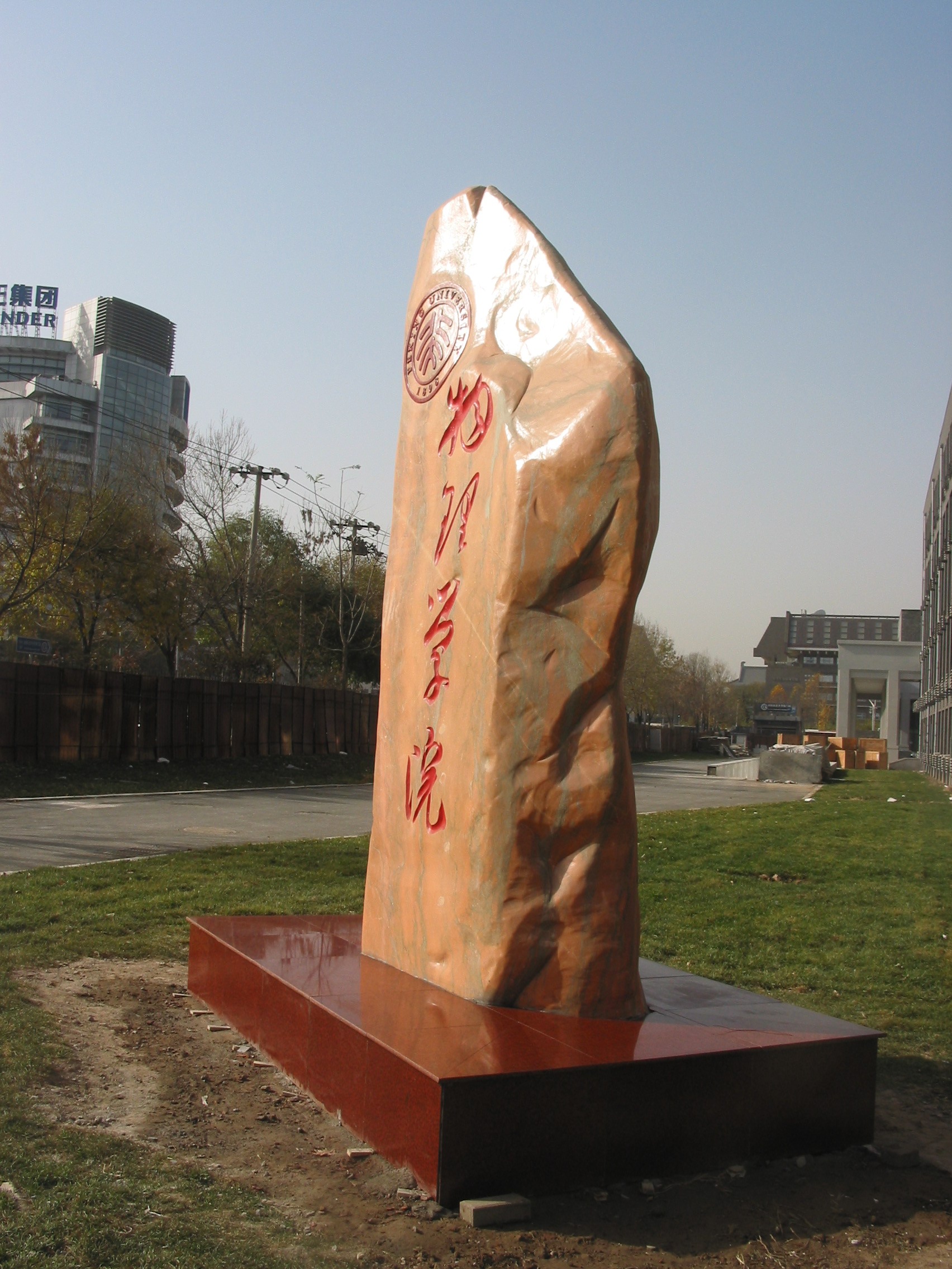 随后我们在北京房山景观石材厂找到一种名为“朝阳红玉”的石头,呈浅暗红色,夹以一些黑色条纹,很是好看。“朝阳红玉”属于花岗岩类的石头,比重和花岗岩相同或稍高;其硬度和材质又接近于玉石,所以有人称它为比较差的玉石;其耐腐蚀性好于花岗岩,寿命可达200年。我们选了横卧和直立两块石头,拍了照片,于2011年11月份,拿到筹委会上讨论。大家肯定了“朝阳红玉”的材质,考虑到物理大楼楼外的场地狭小,大型横卧门石不太合适;对所选直立的石头过于瘦小也不甚满意。于是我们马上在网上收索,发现河南信阳的“晚霞红”石材和“朝阳红玉”极为相似。深入了解后知道,二者是一回事。河南信阳是“朝阳红玉”的原产地*。一块高4米、宽2米、厚0.9米、重约13吨的石头落入我们的视野。它粗壮挺拔、曲线优美、浅暗红底中镶嵌着几条黑绿色的条纹…..。正面大体平整的部位正好可以刻“物理学院”四字,刀削般的左侧面适于竖刻School
