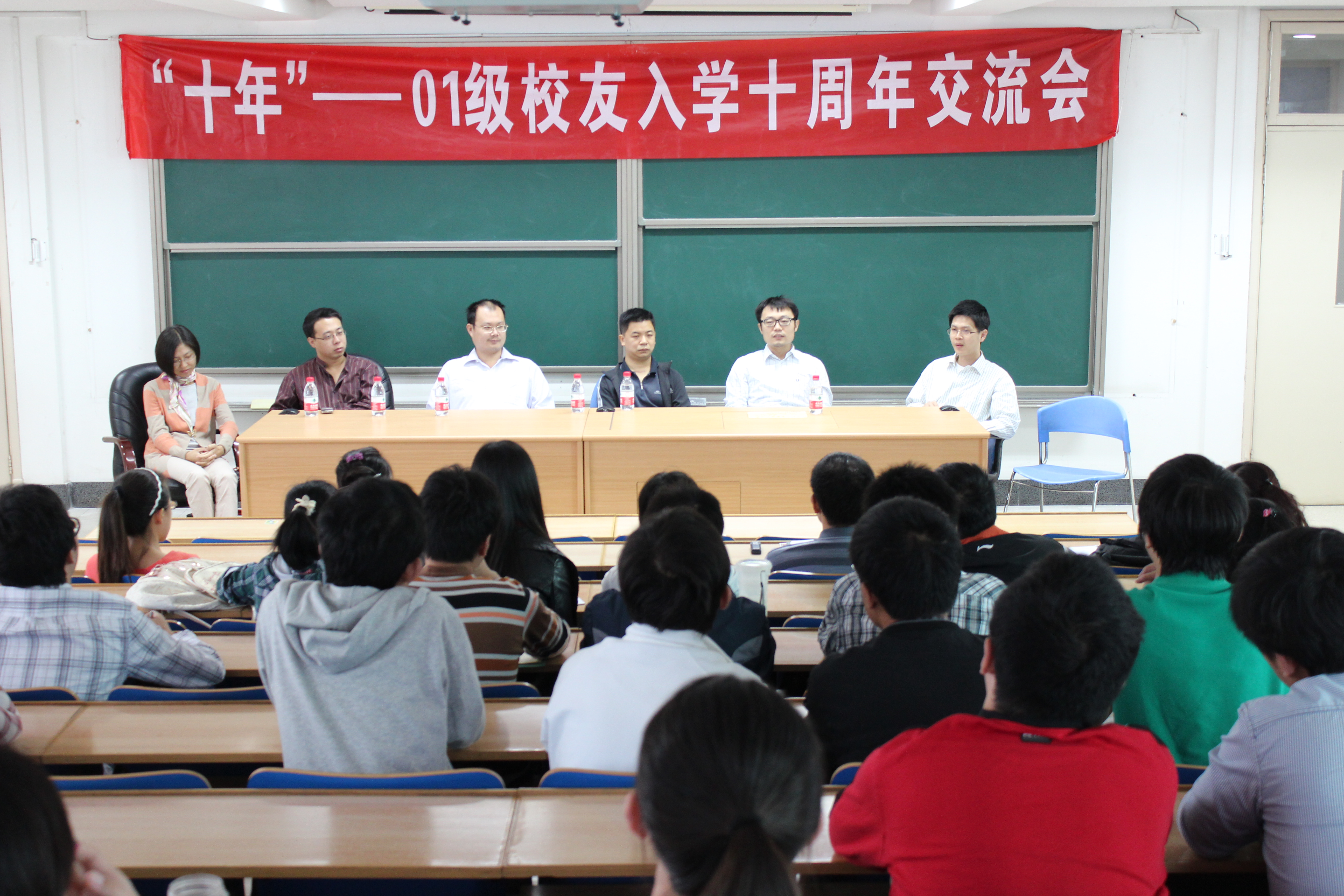 2011年9月11日,“十年”——01级校友入学十周年交流会研究生专场在物理楼中212举行。六名01级校友和2011级研究生新生参加了本次活动。在热烈的现场气氛中,校友们就同学们关心的问题进行了深入细致的讨论,并给予同学们中肯的建议,给同学们的校园生活及未来规划打下了良好的基础。