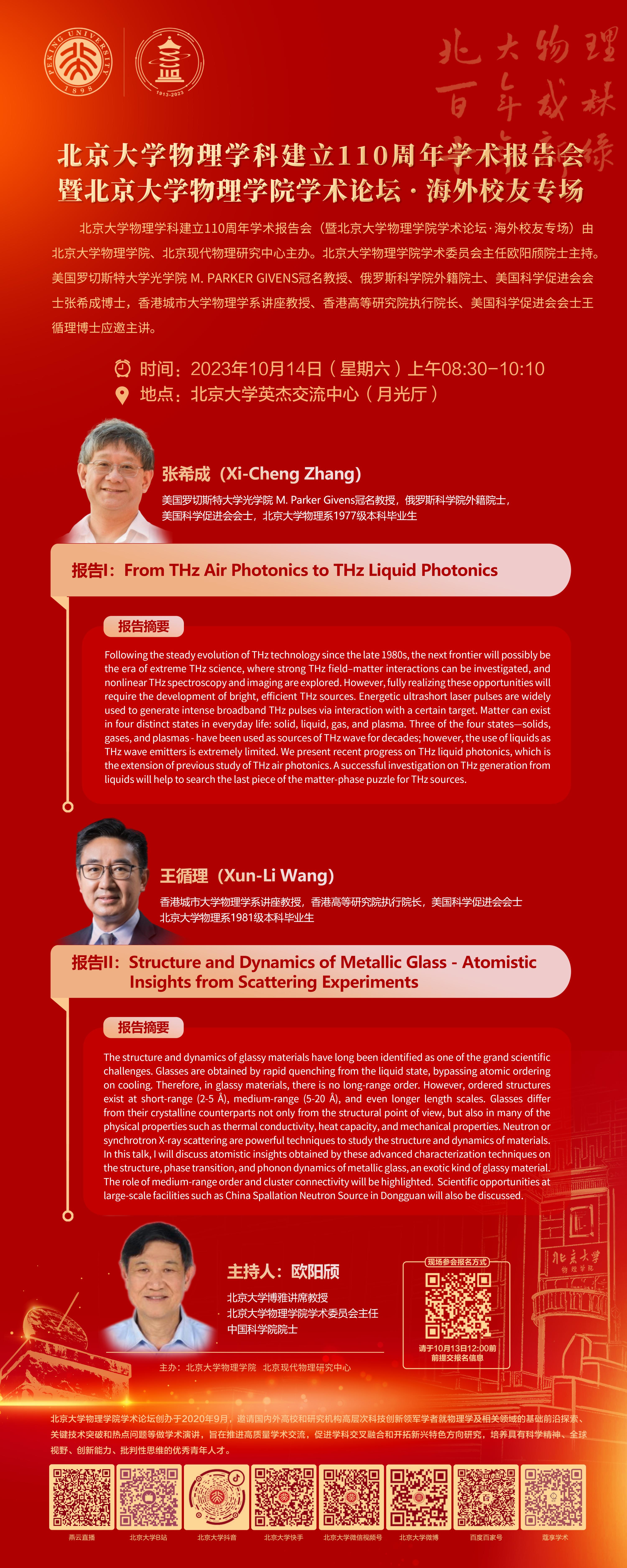 我院物理学科建立110周年学术报告会(暨我院物理学院学术论坛·海外校友专场)由我院物理学院、北京现代物理研究中心主办。我院物理学院学术委员会主任欧阳颀院士主持。美国罗切斯特大学光学院 M. Parker Givens冠名教授、俄罗斯科学院外籍院士、美国科学促进会会士张希成博士,香港城市大学物理学系讲座教授、香港高等研究院执行院长、美国科学促进会会士王循理博士应邀主讲。