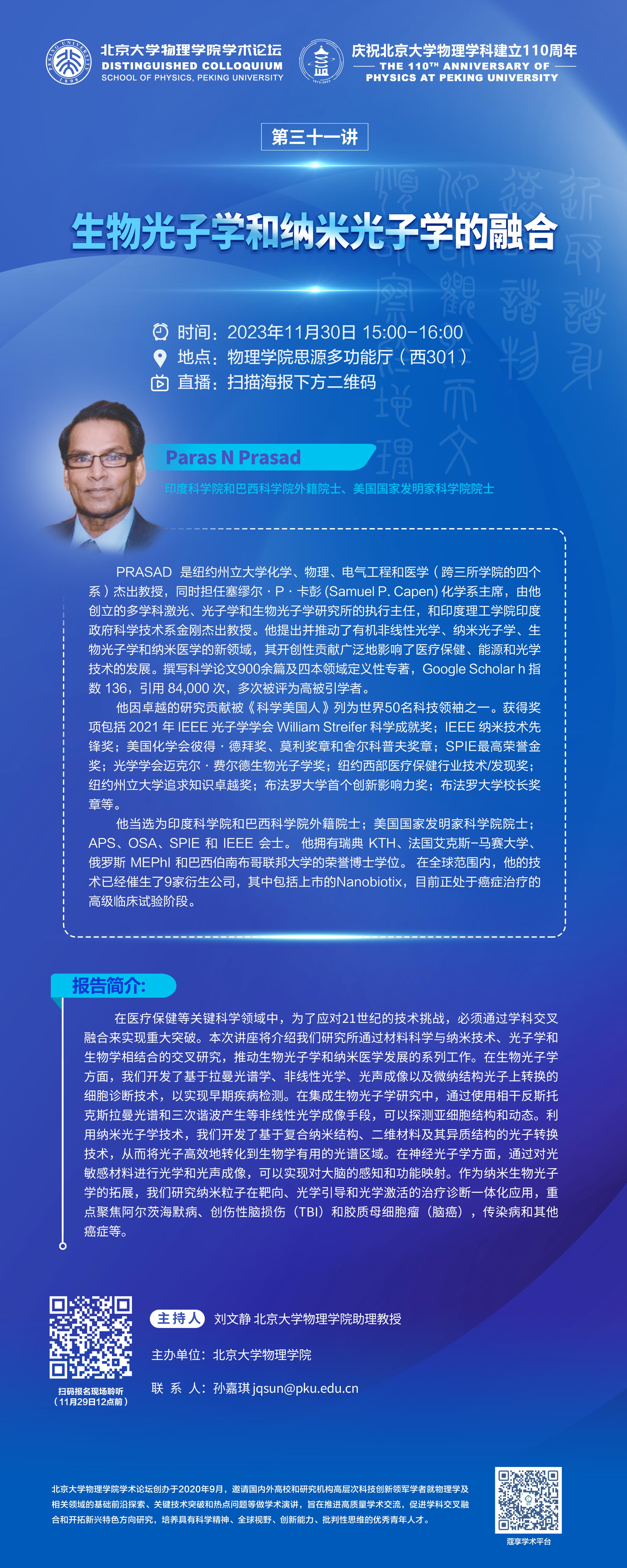 PRASAD 是纽约州立大学化学、物理、电气工程和医学(跨三所学院的四个系)杰出教授,同时担任塞缪尔·P·卡彭 (Samuel P. Capen) 化学系主席,由他创立的多学科激光、光子学和生物光子学研究所的执行主任,和印度理工学院印度政府科学技术系金刚杰出教授。他提出并推动了有机非线性光学、纳米光子学、生物光子学和纳米医学的新领域,其开创性贡献广泛地影响了医疗保健、能源和光学技术的发展。撰写科学论文900余篇及四本领域定义性专著,Google Scholar h 指数136,引用84,000次,多次被评为高被引学者。